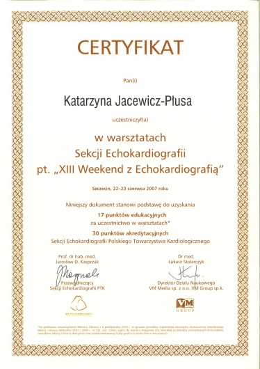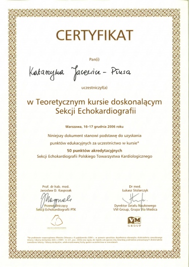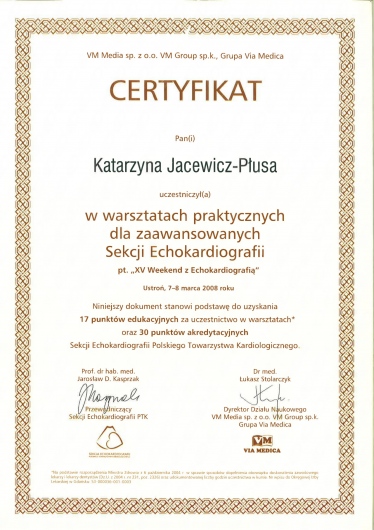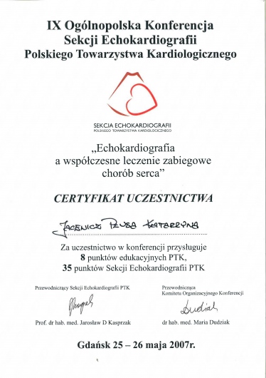 Posiada duże doświadczenie w zakresie diagnostyki nieinwazyjnej – wykonywania badań ECHO serca, prób wysiłkowych oraz oceny zapisów holterowskich.