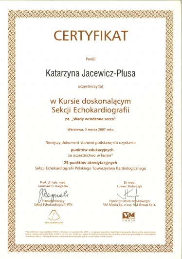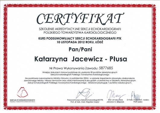 Dr n. med. Katarzyna Jacewicz-Płusa wykonuje w Gabinetach lekarskich „profesorkarcz.pl” badania echo serca. Nie znam nikogo, kto z podobną życzliwością przekazywałby pacjentowi po badaniu „przedłużenie gwarancji”. Badanie echo serca dla wszystkich tych, którzy cenią ponadprzeciętną wnikliwość i kompetencję. A do tego pani doktor korzysta ze sprzętu klasy premium – GE Vivid E95, aparatu zazwyczaj dostępnego jedynie w najlepszych szpitalach kardiologicznych jak Instytut Kardiologii w Aninie.