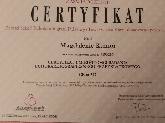 Od ponad 25 lat dr Kumor pracuje w Instytucie Kardiologii w Warszawie (Anin), obecnie w Klinice Wad Wrodzonych Serca, gdzie badania echokardiograficzne wykonuj na co dzień od ponad 15 lat. Pracując w Pracowni Echokardiografii Instytutu Kardiologii ma doświadczenie zarówno w badaniach ambulatoryjnych jak i w szpitalnych, w tym w badaniach śródoperacyjnych i w badaniach pacjentów po najróżniejszych operacjach kardiochirurgicznych. Wykonywanie badań echo w jednej z najlepszych klinik kardiologicznych w Polsce pozwoliło pani doktor nabyć unikalne doświadczenie w badaniach pacjentów z różnymi chorobami serca, w tym także pacjentów po zawale serca oraz pacjentów z wadami nabytymi i skomplikowanymi wadami wrodzonymi serca.