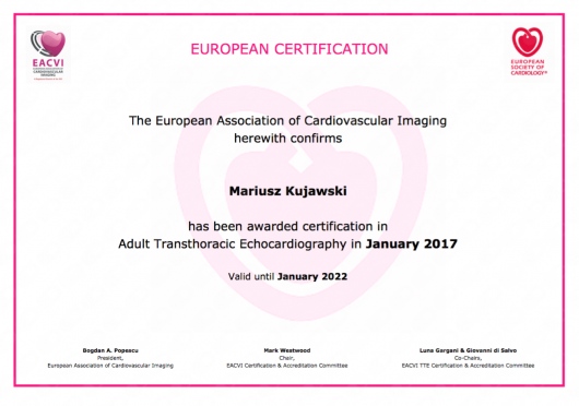 Echokardiografista certyfikowany europejskim certyfikatem EACVI.